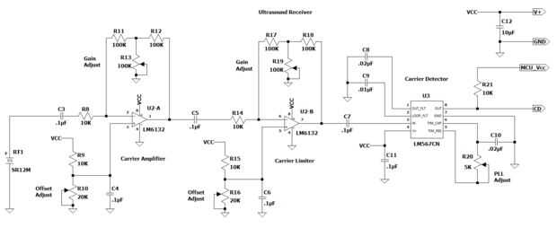Aviso que la segunda etapa del amplificador se refiere como un limitador de amplificación. Este circuito es casi idéntico del amplificador de portadora con una excepción: el voltaje bias es ajustado de manera que el offset de salida es 0V cuando se detecte ninguna señal. La razón de esto tiene que ver con medio ambiente ruido ultrasónico causando falsas alarmas del Detector de portadora. Muchas fuentes de ruido audible (chasquear los dedos, hirviendo agua, metal que forma, etc.) crean sonido débil del espectro ultrasónico. Este ruido puede causar el LM567 generar ráfagas cortas de actividad incluso cuando el transmisor no está encendido. Con el ajuste cuidadoso del limitador, ruido de fondo puede extraerse el Detector de entrada para que el Detector de salida sólo activa cuando se hacen mediciones de ultrasonido.