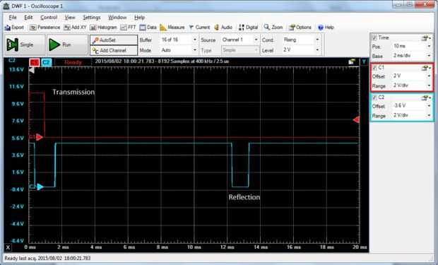 Después de que el telémetro ha sido montado y probado, puede acoplarse un osciloscopio a la salida del transmisor que (TE) y detectar portador (CD) para ver el receptor y el transmisor en acción. La traza del osciloscopio anterior muestra el pin TE rojo que el oscilador de 40KHz. El rastro azul muestra la salida del detector PLL. Observe que porque el receptor está tan cerca del transmisor cuando se TE es permitido la salida de CD va baja mientras transmite y entonces inactivo después de que la transmisión se detiene. Poco tiempo después, el pin de CD va bajo otra vez indicando que se ha detectado una reflexión. Un microprocesador se utilizará para medir el tiempo de retardo y convertirlo en una distancia.