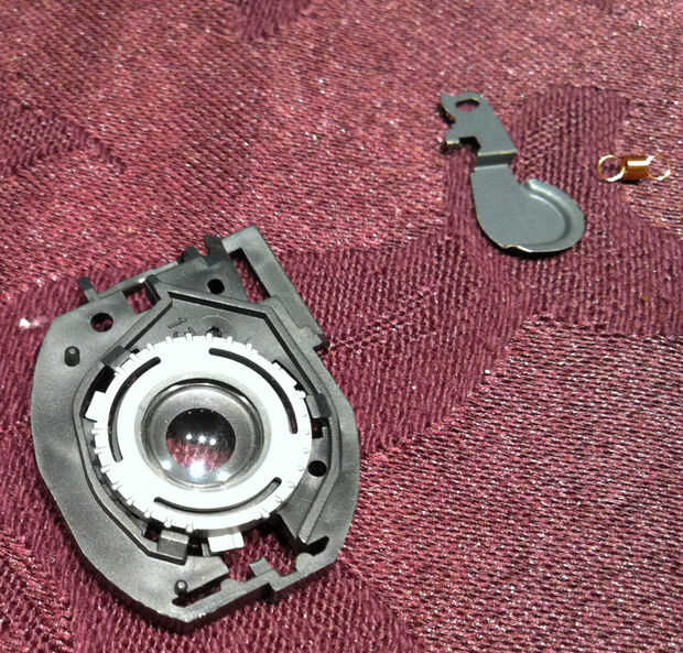 Retiro de la lente de la cámara es simple y puede hacerse a mano. Tenga cuidado sin embargo, si utiliza las manos porque puede haber bordes filosos en el plástico. Si usted tenga cuidado al desmontar te puede recuperar los resortes muy finos, qué hacer con ellos queda a su imaginación.