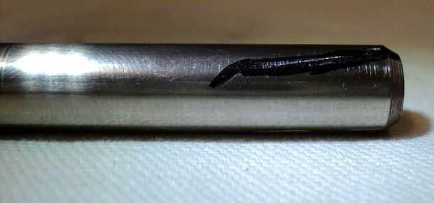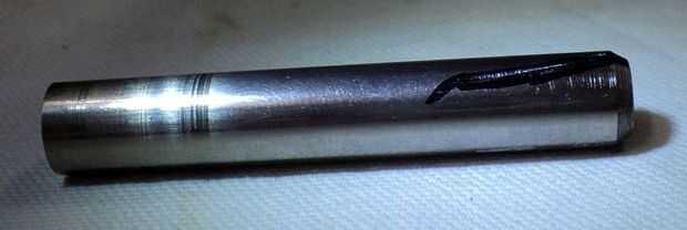 Esta herramienta es aún más fácil la recostrucción de la broca, otra vez comenzar simplemente chaflanando la punta, y golpe con un cincel, un golpe bastante fuerte para presentar un trastorno de material en línea con el eje. Un ligero ángulo de centro será tolerable, pero mantenerlo al mínimo. Este abultamiento es realmente va a hacer el sobredimensionamiento de minúsculo agujero necesario para permitir un ajuste deslizante de la línea de eje. Si produce un agujero demasiado grande, dibuje un archivo a través de ella para reducir el agujero a la dimensión deseada. Ausencia de un cincel, granete aplicado en una serie de golpes también puede ser suficiente, pero siempre he tenido a la mano un cincel.