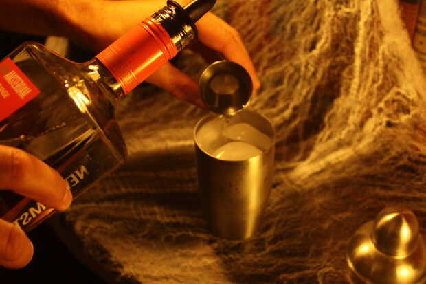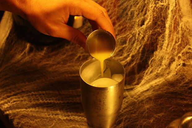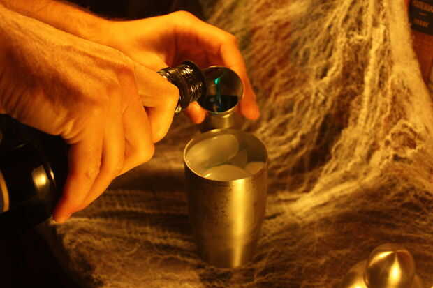 Ponerles la parte superior, luego la tapa y agite vigorosamente durante cinco o más segundos. Tomar la tapa y vierta en un vaso de martini bien frío o cáliz de Halloween.