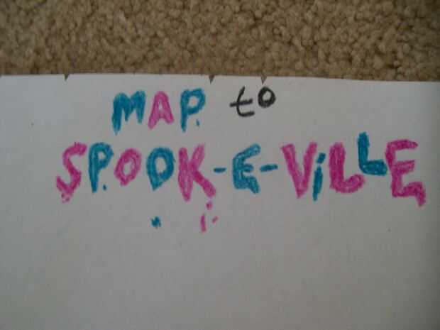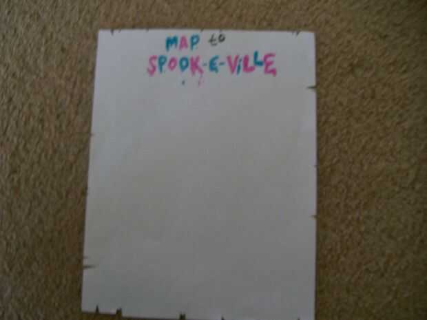 Escribir el título "mapa de SPOOK-E-VILLE" hasta en la parte superior. Se alternan los colores azul y marrón para cada letra. He querido mío para ver dibujos animados realmente así que corte un montón de mellas y cortes alrededor del perímetro del papel.
