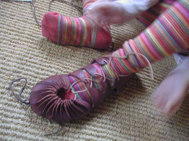 Dibujar una cadena de cuero a través de los orificios como se muestra aquí y en el cuadro #1 y Pruébese los zapatos (preferiblemente en su propio pie y no en tu hijo :))