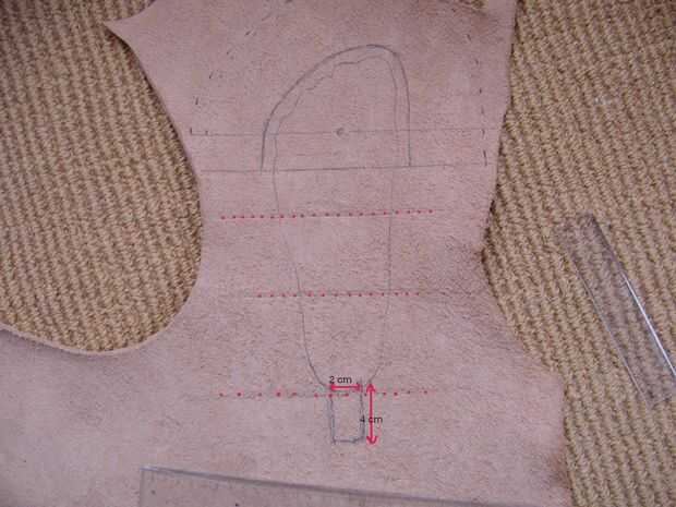 Dibuja la tapa del tacón, unos 2 cm de ancho y 4 cm de largo. Marcar tres líneas (las líneas rojas punteadas).-estos puntos marcan el final de la parte del talón (la línea de fondo), y también entre las 'orejas' que viene a continuación (las dos líneas superiores). Una vez más, hay poco punto en dar medidas aquí, pero otra vez mirar donde las líneas se colocan en el pie. Y recuerden que es todo muy aproximadamente. El zapato se puede hacer con dos o tres 'orejas'. Estos se realizan con tres. Si eres bueno en la medición con sus ojos solamente, este paso puede omitirse completamente.
