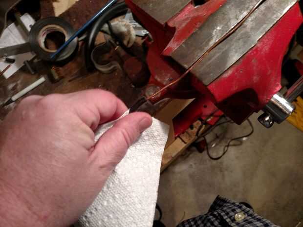 El interior es apenas lo suficientemente grande como para que el alambre se deslice en el diámetro de la tubería, pero comienza a agarrar después de unas cuantas pulgadas. Tienes lubricante su alambre e introducirlo en el tubo y empezar a trabajar hacia abajo. Aplique lubricante a lo largo del camino. La prensa ayuda a sostener mientras trabajas el tubo hacia abajo.