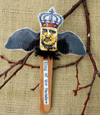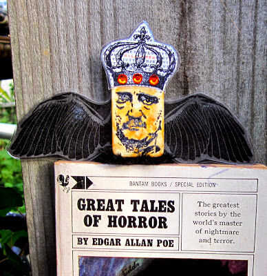 este Edgar Allan Poe mixta ensamblaje pieza nace de tres piezas de madera que he pintado de negro (bloque, carrete, pieza del juego). La imagen de Poe y la palabra "Nunca más" son sellos digitales de Tinta manchada. Las alas estampadas con un se