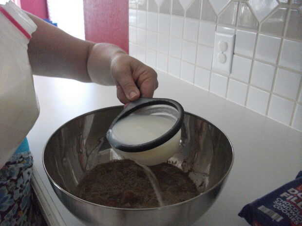2. Añadir la leche fría a la mezcla de pudín. Asegúrese de medir cada taza con cuidado