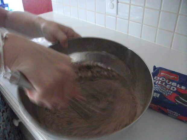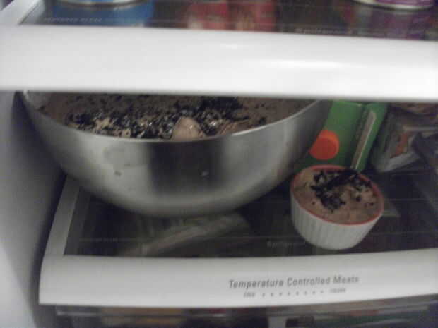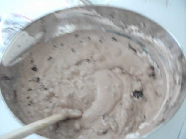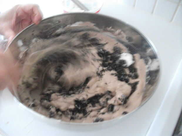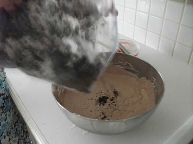 7. Añadir 1/2 la bolsa de galletas Oreo machacada al pudín y revuelva...