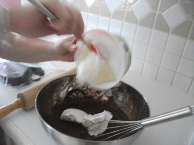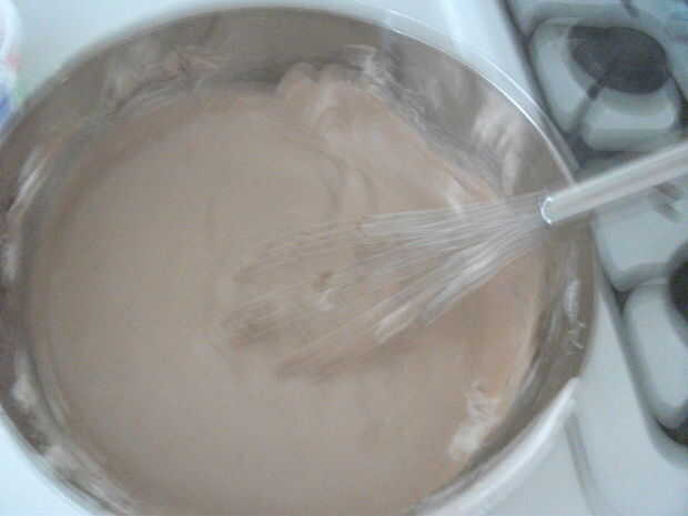 3. batir con leche y leche fría con un batidor de alambre hasta que estén bien mezclados, unos 2 minutos.