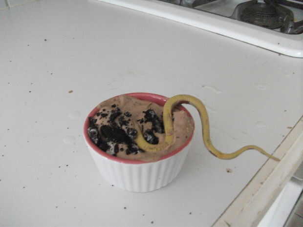 Verter en recipientes de porciones individuales. Puede superior pudín AKA tierra con gusanos gomosos, las ranas gomosas o flores de caramelo.