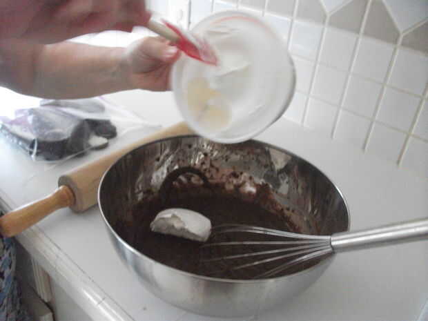 6. mezclar en dos recipientes de descongelado Cool Whip a la mezcla de pudín.