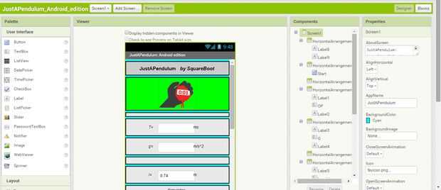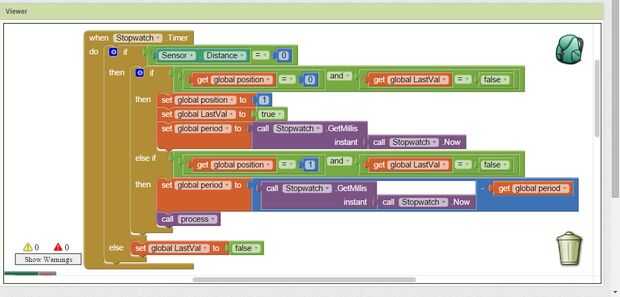 Como un Arduino, App Inventor 2 tiene una función llamada millis: devuelve el tiempo en milisegundos, por lo que la aplicación espera la bola, empieza el contador y cuando la pelota llega otra vez cerca del sensor de proximidad, JustAPendulum sustratos la hora actual en milisegundos con el último valor.