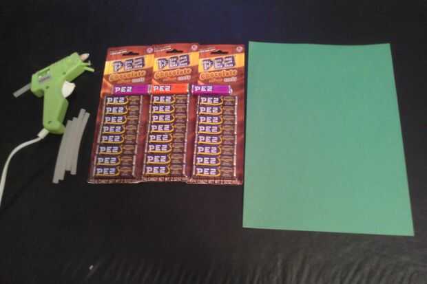 Se necesita:-tres pack de 8 juegos de caramelos PEZ, preferentemente de chocolate. Almacenarlos de una forma fácil llegar al contenedor. -Verde, azul y negro papel de construcción. -Tijeras. -Pegamento de cualquier tipo (pegamento en este caso).