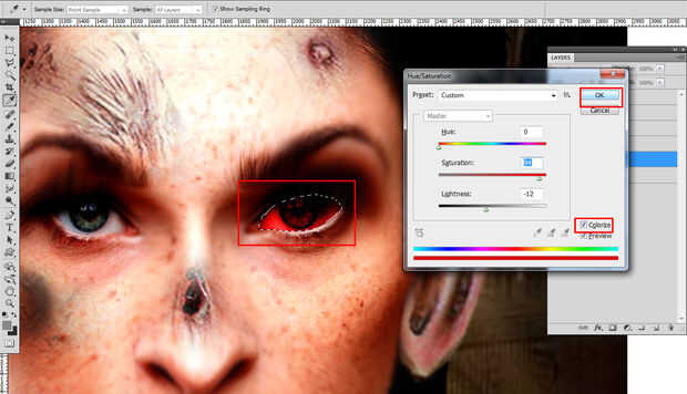 Seleccione "ojos utilizando la herramienta lazo y ajustar el tono de rojo. Asegúrese de que ha seleccionado "Colorear"