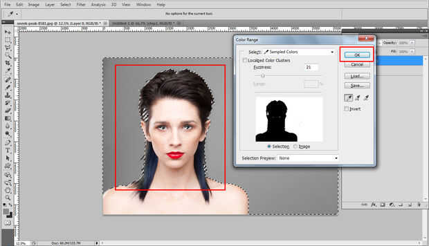 Establecer tolerancia a 21, cambio haga clic en el fondo gris hasta llegar a una buena selección, si tienes la selección de caracteres no te preocupes en este momento puede anular la selección con la herramienta de lazo después. Golpe ok para seleccionar la región no deseada. Ref 03 jpg