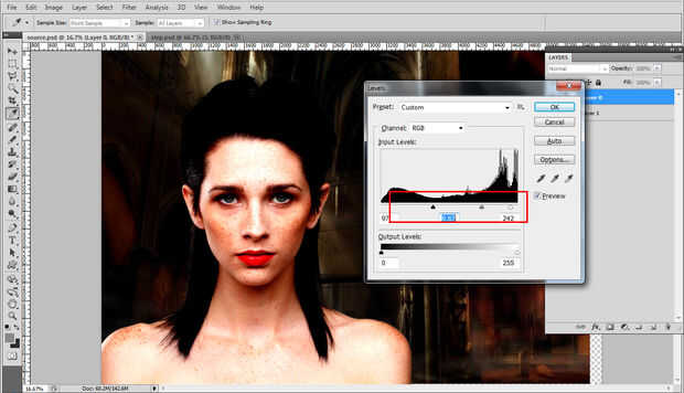 Seleccionar la capa del personaje colocada por encima de la imagen de fondo. Golpe CTRL + L para ajuste del nivel de fina sintoniza la imagen hasta llegar a una sincronización con la imagen de fondo. Ref 06 jpg