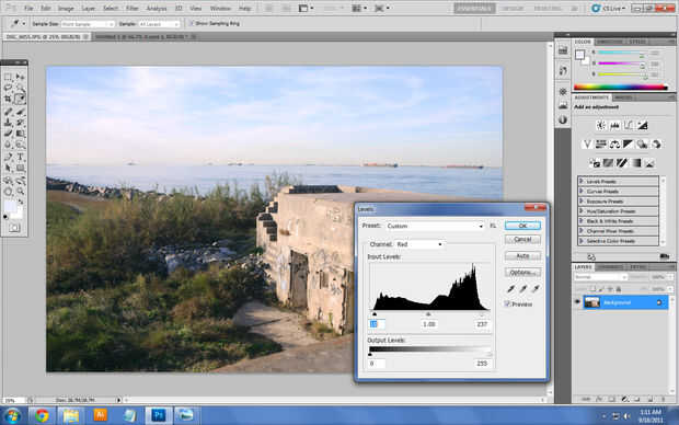 Cambiar al canal "R" o "Rojo" para trabajar en él. En los bordes de su histograma verás cualquiera de los dos picos en el gráfico o estas depresiones pueden ser causadas por cualquier número de razones, pero independientemente de la fuente-no necesitamos em! Haga clic en los reguladores blanco y negro en la parte inferior se deslice justo después de la espiga, depresión en el histograma. Esto limpia el ruido y hace que los colores de la foto realmente se destacan!