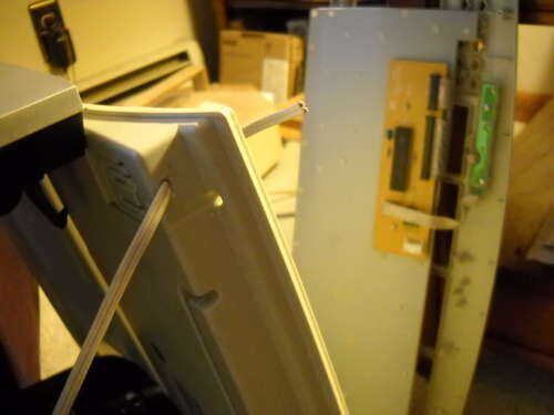Con los dos trozos de cable, tire de los extremos por los agujeros nuevos en los teclados. Un cable debe ser a través de la esquina superior izquierda e inferior derecha, el otro debe ser a través de la parte inferior izquierda y superior derecha.