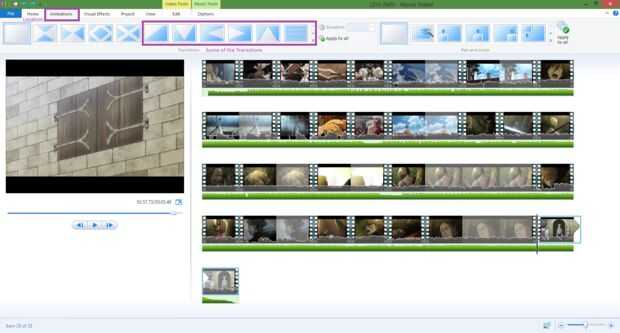 Ahora que todos tus vídeos en su lugar puede Agregar transiciones de lujo si desea. En la parte superior hay una casilla que dice 'Animaciones'. Allí se puede elegir entre las diferentes opciones. Seleccione el clip que desee en, el programa hará el resto. Juego de golpear y ver cómo se ve.