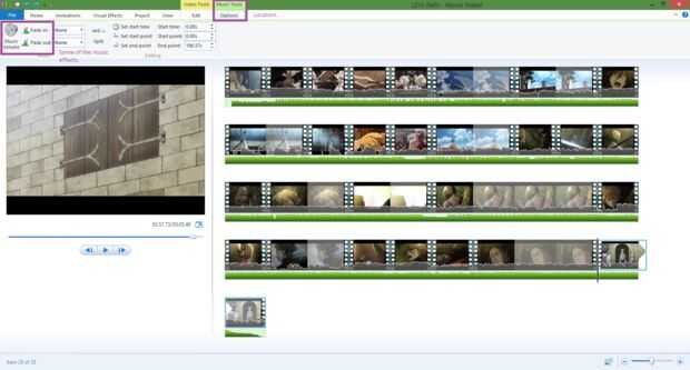 En la nota verde 'instrumentos musicales' hay una pestaña de 'Opciones' que se puede ir en un juego con su música. Puede controlar volumen de un clip individual o que se descolora adentro o hacia fuera si usted desea.