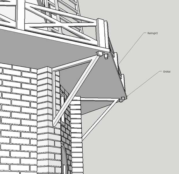 Una vez montados los pasamanos que la plataforma Orbital pueden ser deslizada en la parte superior de la parte inferior del molino de viento. Los ocho soportes orbitales deben fijarse en este punto como se muestra arriba. Hay no hay surcos o ranuras así que no se busca! Es a usted a ser limpio y preciso.