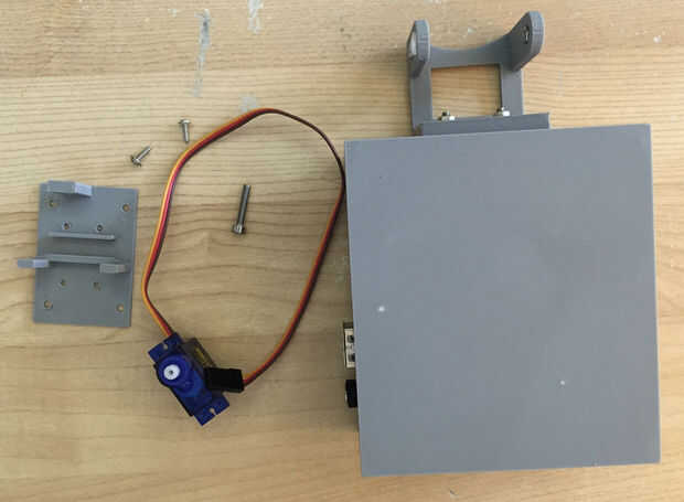Este es probablemente el dolor más grande en la parte del culo del proceso de montaje. Al menos generalmente es para mí. Como con el inicio de servo pan por centrar el servo tilt. Luego lo monte en el cuerno del servo que se encaja en el conjunto de inclinación como se muestra arriba. La placa frontal de la cámara debe vertical y frente hacia la parte inferior de la caja.