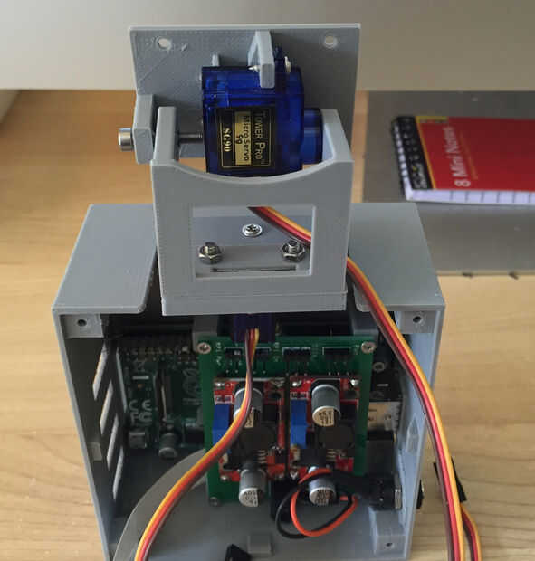 Para completar este paso roscar un tornillo a través del inclinación servo montaje en el mecanismo de inclinación y la tuerca que está incrustada en la parte de plástico para este propósito.
