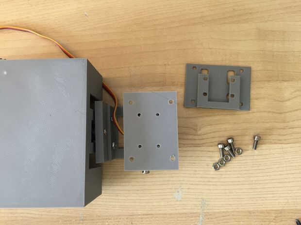 Fije el soporte de cámara para el servo de inclinación mediante cuatro pequeños tornillos y sus tuercas correspondientes.