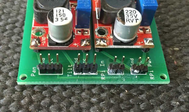 - Empezar por soldar cuatro cabeceras de uno de los pines en la parte inferior de cada una de las fuentes de alimentación de dos. El pasador corto debe extenderse hacia arriba a través de la Junta de suministro de energía y soldar en la parte superior.