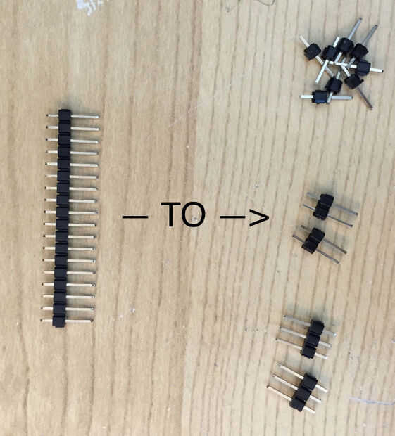Todos los componentes se deben soldar a la parte superior de la placa de circuito (donde se impresión las letras). Primero empezar por romper la cabecera en las piezas que necesita:
