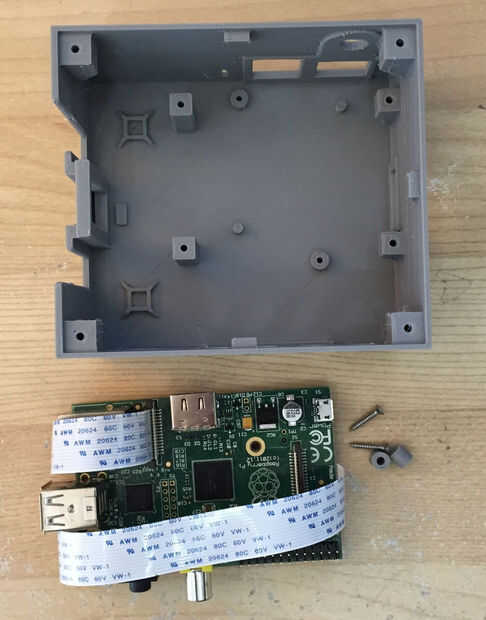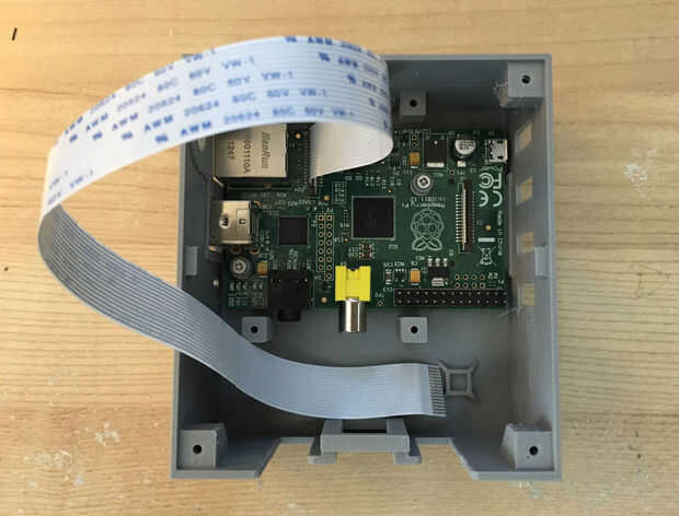 Conecte el cable de cámara Pi Pi de frambuesa e Inserte la Junta en el caso. Utilice los tornillos con los distanciadores separadores para garantizar el IPC para el caso. Si no estás seguro de que el cable está conectado correctamente y que la cámara está trabajando, ahora podría ser un buen momento para saltar hacia adelante en las instrucciones sólo para asegurarse de que!