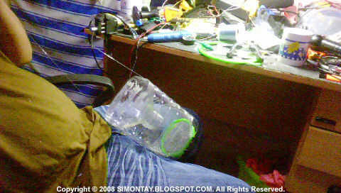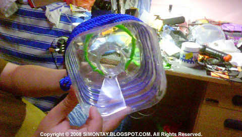 Aquí terminas por perforación 04x2mm (2 en cada lado de la parte superior) a través de la botella y la parte superior para que la parte superior se ajusta muy bien sin ningún sujetador como grapas o alfileres. Esta forma es la línea de pesca que está sujetando la parte superior de la botella.