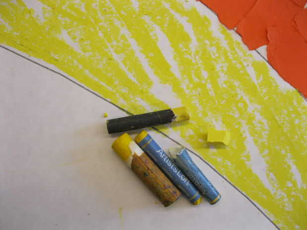 Cuando el área amarilla ha sido coloreado hacer una técnica de resistir cray-pas donde el área se pinta con el color amarillo del agua. Recordamos un bajo el proyecto de mar lo hizo a principios de año donde peces de brillantes colores fueron dibujadas con el cray-pas y luego pintadas con acuarela azul lavamos. El papel absorbe sólo la pintura donde no ha habido ningún cray-pas aplicado. El aceite en el cray-pas resiste la pintura.