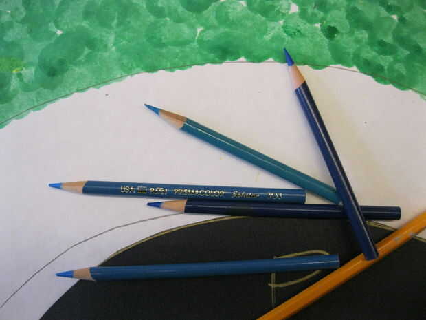 La sección azul es trazada de la cartulina y lápices de colores se utilizan para hacer la zona azul del arco iris.