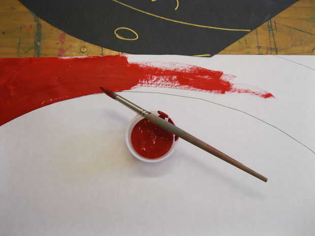 Mis hijos utilizan témperas rojo para llenar en la primera sección de su arco iris. Recordamos el inicio del año escolar cuando estudiaban una unidad en la rueda de colores primaria y colores secundarios y también la forma correcta de utilizar un pincel.