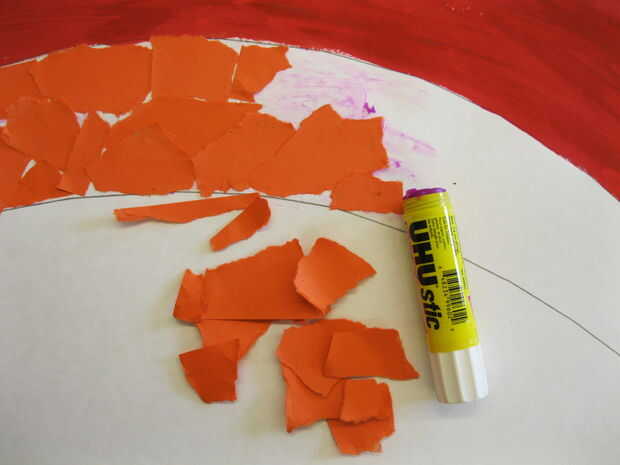 Con un palo de pegamento los papeles rasgados naranja se agregan al arco iris. En este punto que nos recuerda que la barra no se extenderá demasiado mucho o se puede conseguir pegado y luego no se puede retroceder.
