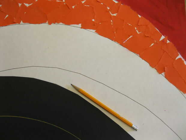 Se corta el pedazo siguiente del papel afiche y se traza la línea para el color amarillo del arco iris.