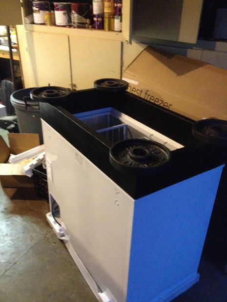 Ahora era tiempo para fijar mi collar recién hecho a mano en el cuerpo del congelador. Después de limpiar todos los bordes, apliqué una generosa cantidad de silicona a los bordes superiores del cuerpo del congelador, asegurándose de que se haría un sello perfecto después de aplicar el collar. Una vez que fue correctamente en su lugar, he añadido pesos a la parte superior del collarín para asegurar un enlace apretado. He dejado esta noche.
