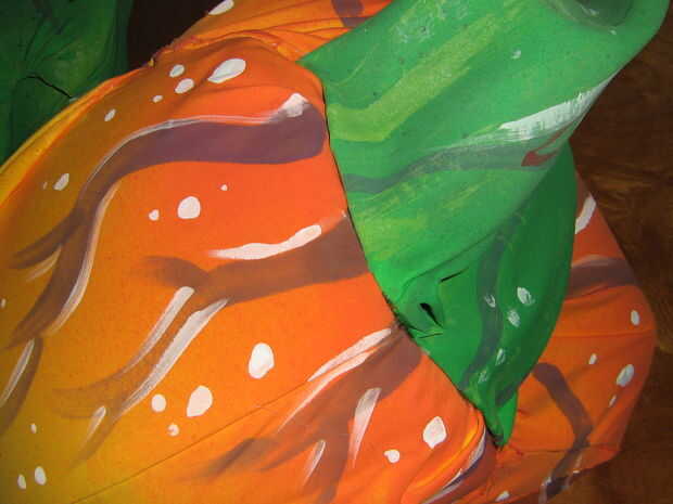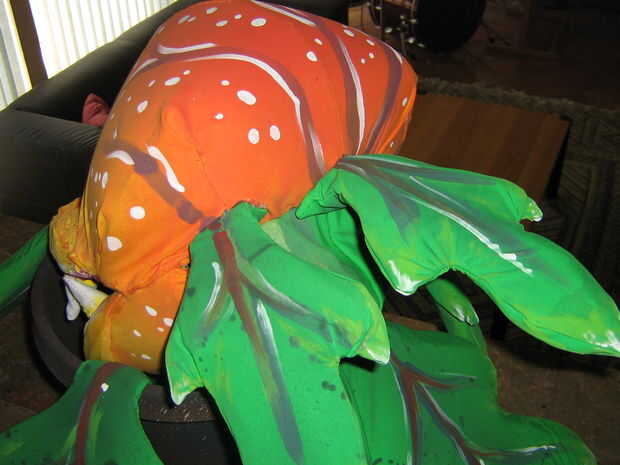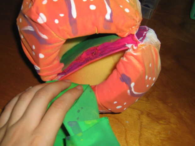 Terminé el borde de cada hoja por doblar a la tela en sí mismo para una costura limpia y cerrando con una franja de pegamento caliente. Las hojas grandes que luego se agregaron al borde de la olla (después de marcar el plástico para ayudar a la adherencia, que no se muestra), y las hojas pequeñas fueron agregadas al cuello de la marioneta.