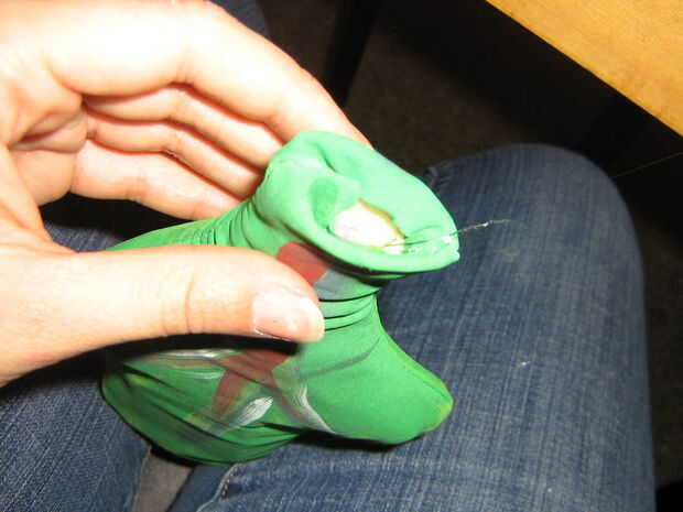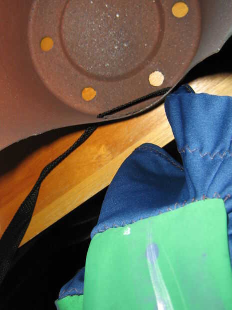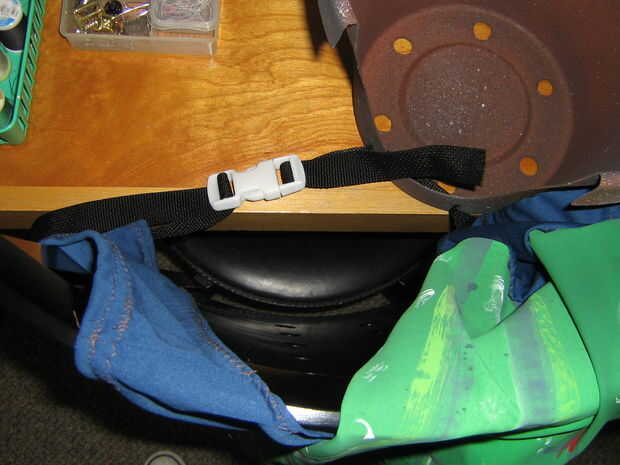 Con estos elementos en lugar, la cinta de nylon del chaleco fue alimentada a través de las ranuras de la maceta de plástico, y las hebillas de paracaídas fueron agregadas. Estas correas se pueden ajustar para adaptarse a la mayoría de cualquier tamaño de titiritero.