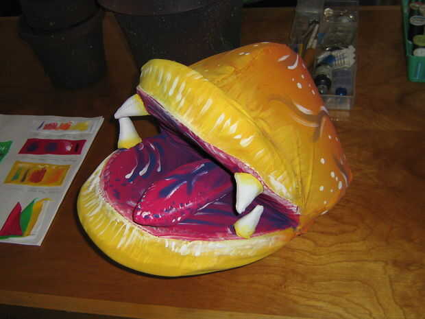 Los dientes se agregan a la boca después de que ambos están pintadas para evitar que salpique demasiado, con solo un poco de pegamento caliente del derretimiento para cada uno.