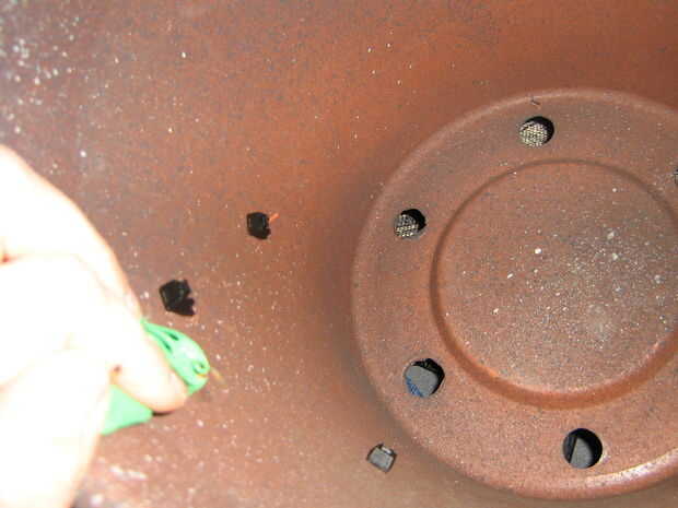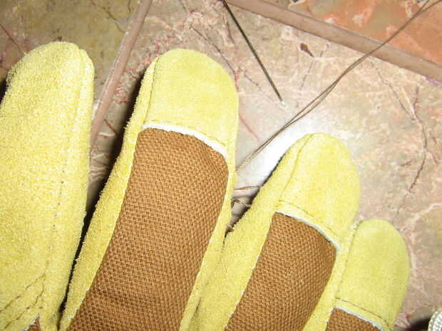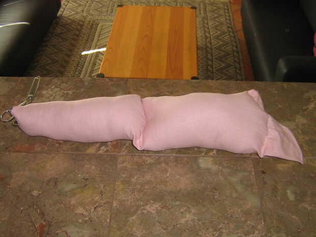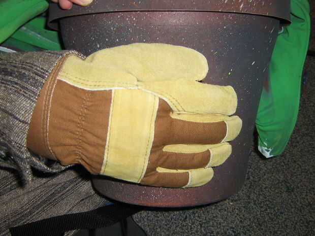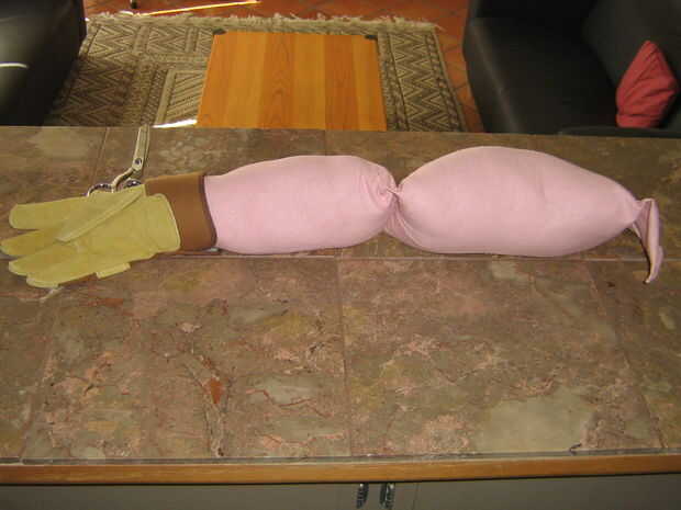 El brazo del maniquí fue deslizado en el manga, y el hombro cosido en su lugar a la guarnición para evitar el movimiento. Con ataduras de cremallera, la mano fue situada en una posición razonablemente realista y atada a la olla (ranuras de corte en el cuero del guante y pequeños agujeros en el pote plástico permiten fijación). Seymour el muñeco ahora puede manipular libremente sin sostener la olla.
