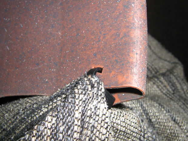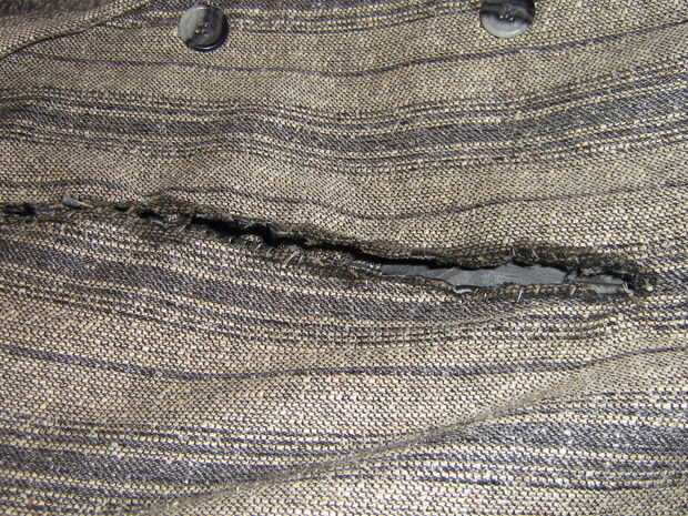 Con el abrigo en la mano, una hendidura grande fue hecha abajo la parte delantera de la prenda. Esto era borde cosido y fray viró para evitar deshilaches. Manga de la marioneta se alimenta a través de la ranura, y el bote atado al frente de la capa con la cinta de control a través de la abertura (Nota: la colocación de la correa del chaleco fue movida desde el fondo de la olla a la parte superior para un mejor rendimiento).