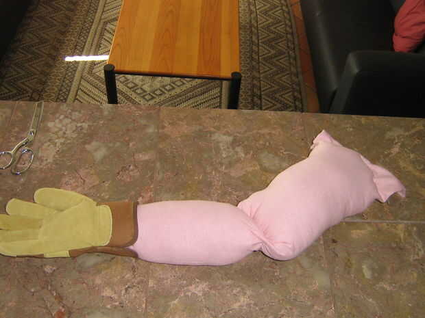 En primer lugar, un brazo falso fue cosido para la manga derecha, relleno y cosido para dar un codo y la articulación del hombro. Para facilitar la coincidencia, las manos son guantes (Seymour lleva el otro guante en su mano izquierda para emparejar). La mano falsa se rellena y los dedos se suturan para posicionamiento más realista.