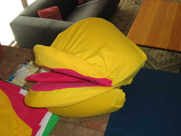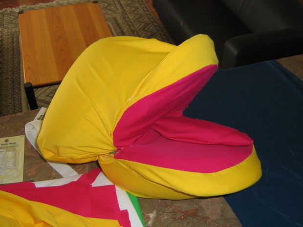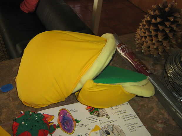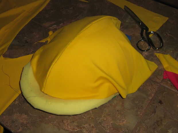 Cada mitad de la cabeza consta de tres piezas de tela, un lado izquierdo y derecho y una pieza para cubrir el labio. El lado izquierdo y derecho fueron dados una costura por la mitad, pero el resto del accesorio a la cabeza de espuma se hizo en caliente-derrite el pegamento. Se trata de una aplicación ideal para tela caliente derretimiento pegamento que se adhiere muy bien a la espuma y la tela.