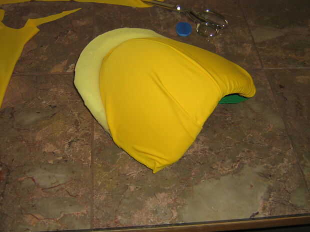 La tela no necesita ser 100% pegado a la espuma, pero es necesario que esté en su lugar no lo suficientemente sólida para cambiar de puesto cuando esté en uso. He logrado esto con una tira de pegamento por el centro de la cabeza y luego una banda de la misma en todos los bordes hacia el interior de la cabeza, así como cualquier lugar donde un borde crudo tocó la espuma. El resto de la tela sigue siendo flojo, pero como se disponen las formas, no es necesario ningún accesorio más.
