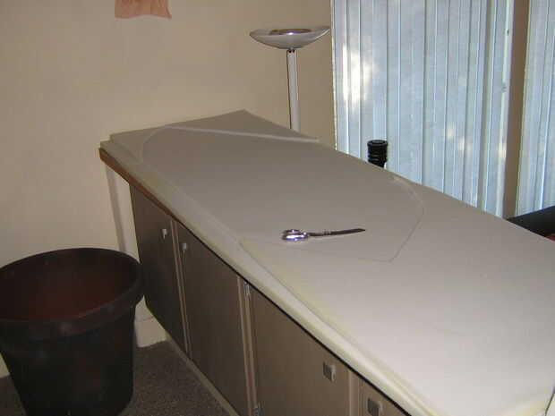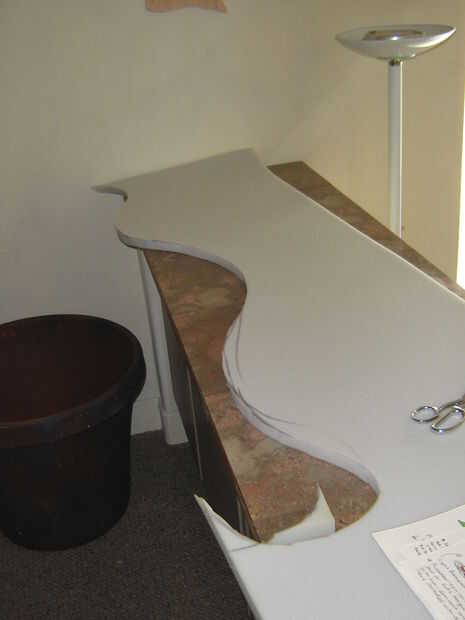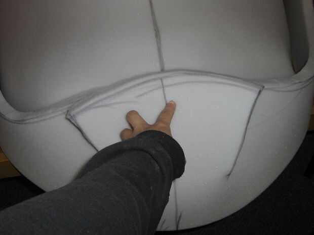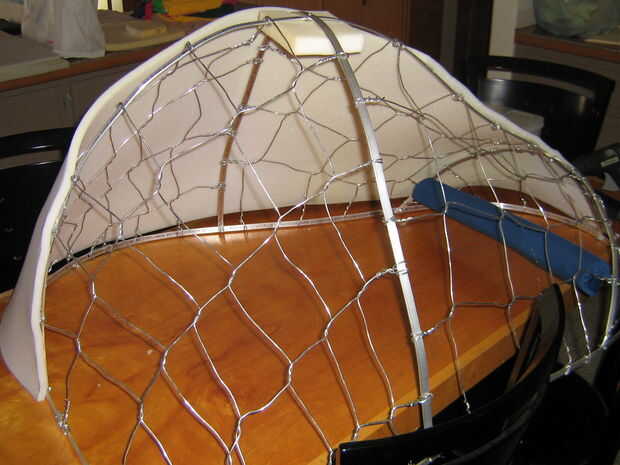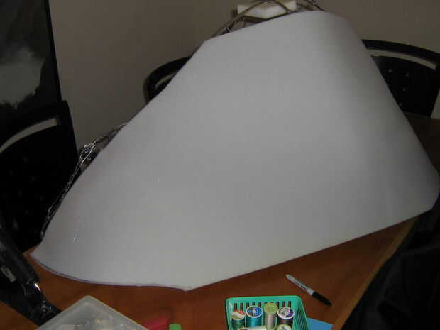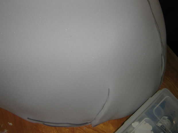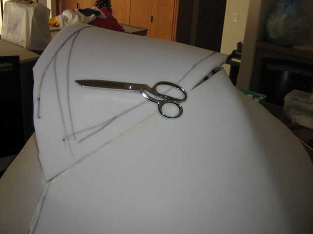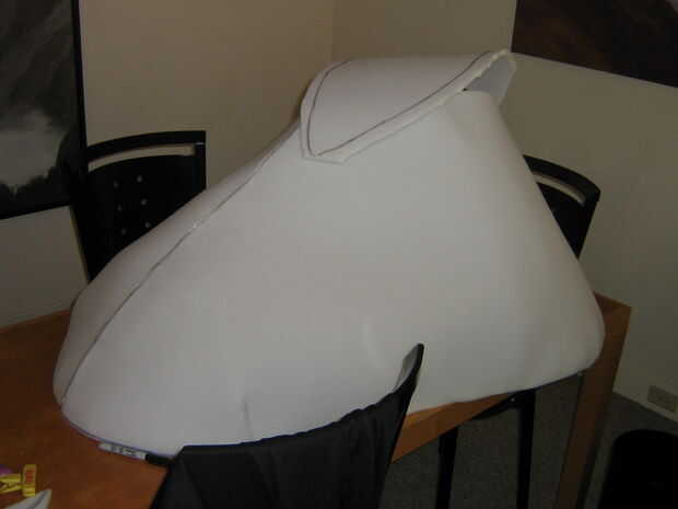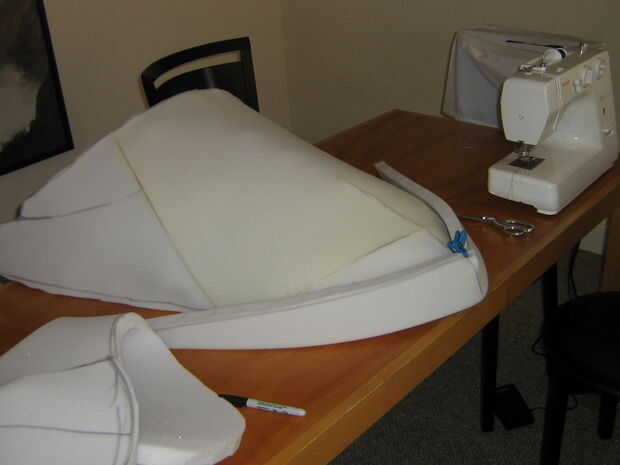 Un borde de espuma cortado 1" espuma (darle una forma más densa) fue cortado pero no unido a la forma en esta fase para permitir pelar más fácil. El labio tiene dos dardos en la nariz de la planta en el labio superior para mejor ajuste a la forma curvada. Cortar y ajustar para adaptarse, las costuras estaban pegadas con pegamento caliente del derretimiento.