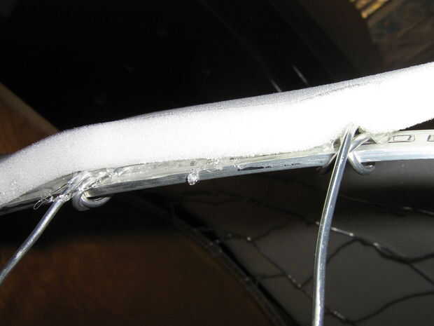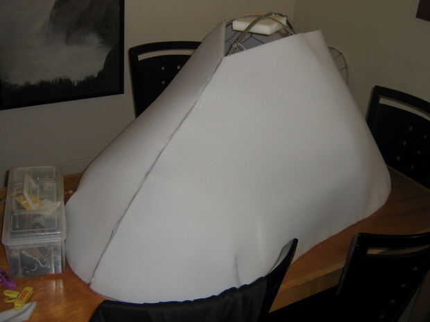 La espuma de la cabeza de esta fase es sobre todo más ligero 1/2" de espuma en lugar de la más grueso 1". Colocación de piezas de espuma sobre la armadura, fueron cortadas para la forma y el derretimiento caliente pegado a la forma, equipadas a lo largo de las costuras para sentarse butted uno contra el otro, en lugar de traslapados uno encima del otro. Estaban pegados a lo largo de cada costura de espuma según sea necesario, sujeta con pinzas hasta que seque.