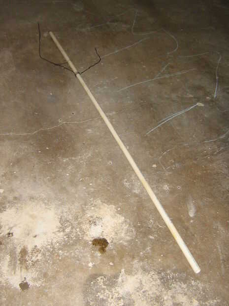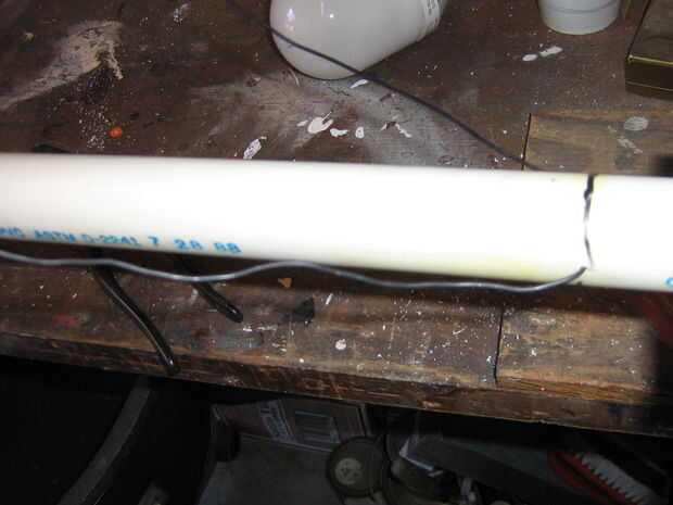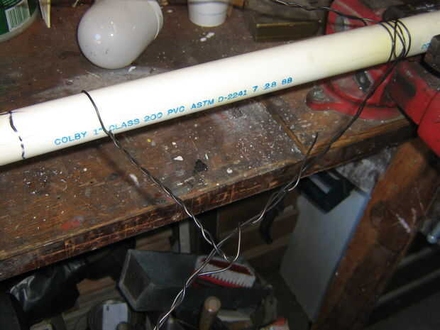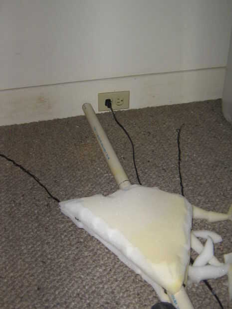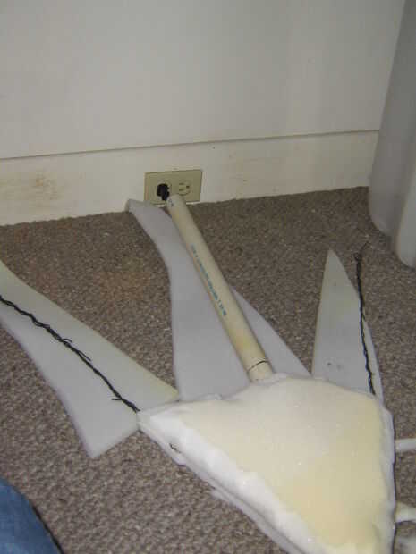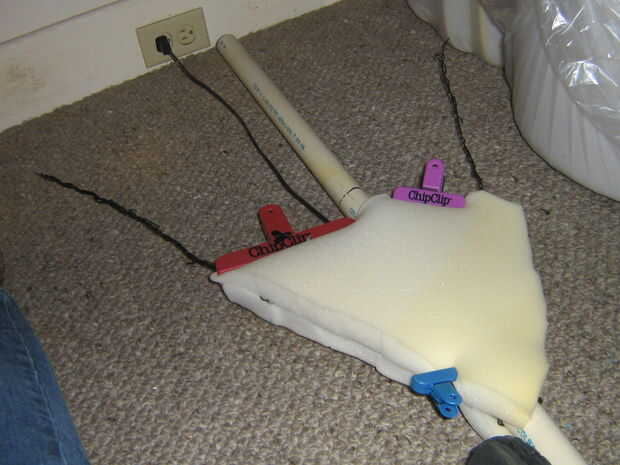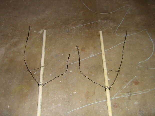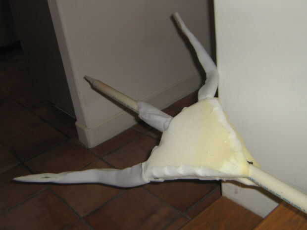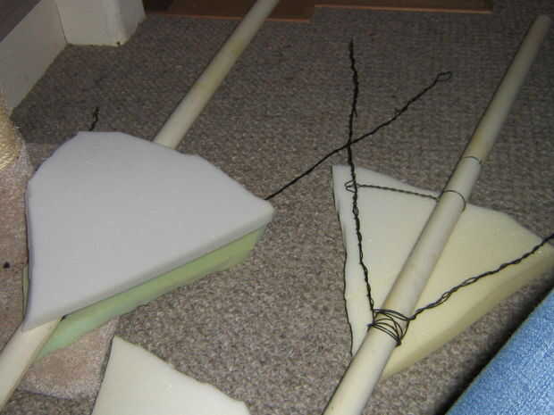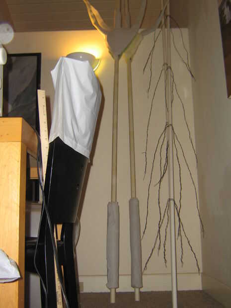 Los brazos se construyeron de manera similar a estas hojas de PVC algo más grande. Como estos se llevan a cabo directamente por actores/titiriteros se fue sin necesidad de compensarlas a nada, y simplemente usé lo que desecho tenía. El patrón de alambre es algo más complicado, se apoyo en una mano como forma. El tubo constituye el principal 'dedo' mientras que el alambre hace un segundo dedo y el pulgar. Estos dos dígitos están compuestos por el mismo cable con el pulgar es algo más corto. Los dos dedos más largos se unen por un cable extra que ayuda a bloquear la 'Palma' de la mano.