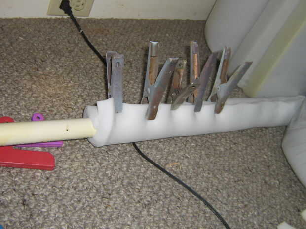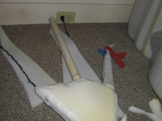 Después de completar la armadura, acolchado de la espuma fue agregado a la palma, los dedos y base de la mano a ella. Esto fue aplicado en un 'sandwich' de la palma y envuelto alrededor de los dedos individualmente, luego caliente del derretimiento pega en su lugar. Todo esto fue cortado a bisel en los bordes cuando el pegamento se sequen. Poco de espuma también fue agregada a la base para hacer los brazos un poco más sólido en ese punto, es muy áspero, pero como la tela va a ser cubierto libremente, no hace mucha diferencia.